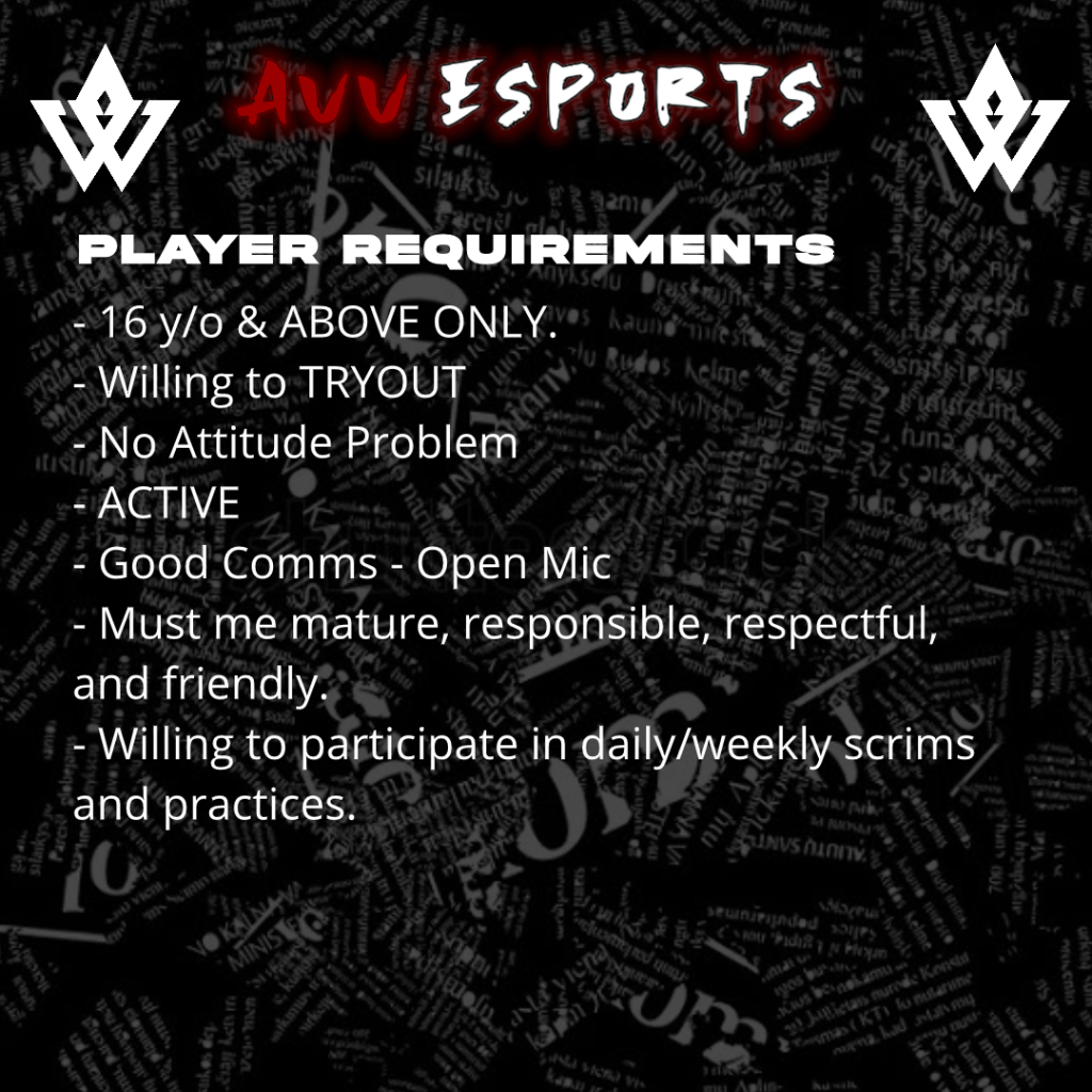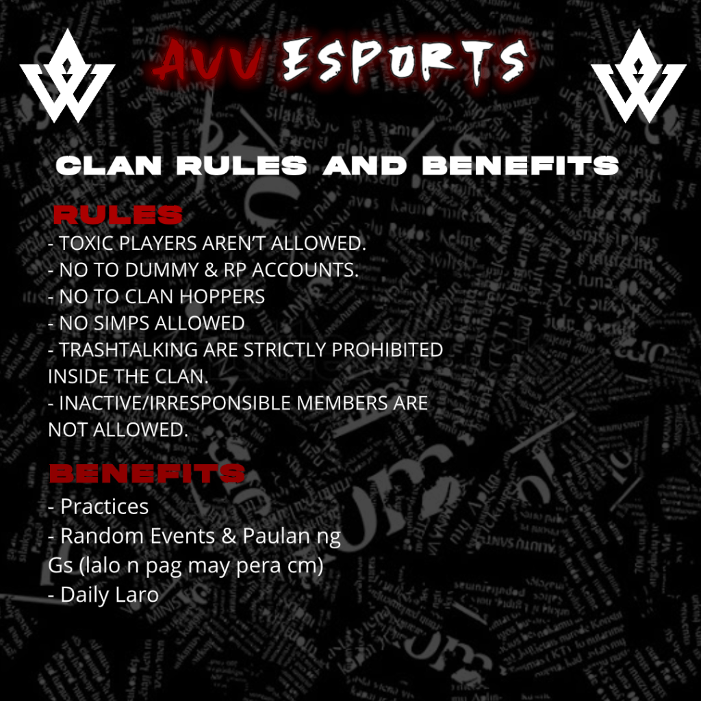 Home WELCOME TO AVV ESPORTS WEBSITE. SCROLL DOWN TO SEE HOW YOU CAN JOIN! This is AVV Acier, our CLAN MASTER. AVV ESPORTS is a NEWLY BUILT CLAN, If you’re looking for a TOP or LEVEL 10 CLAN, i suggest not joining AVV. OFFICIAL CLAN PAGE avvesport@gmail.com Facebook Page
